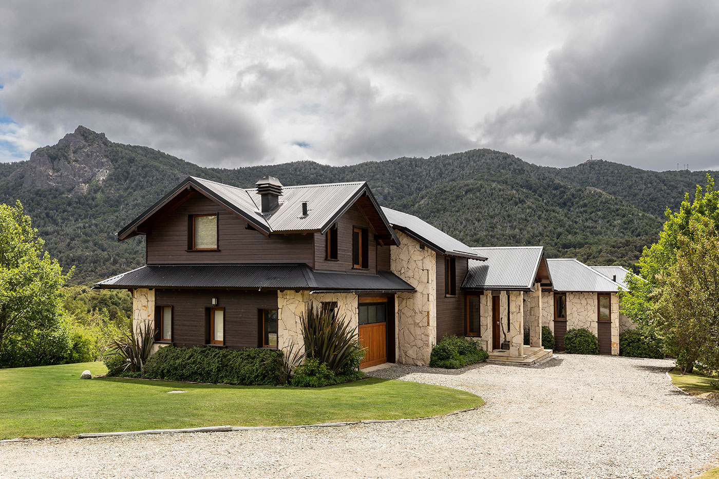 Un rápido esquema del Arq. Pablo Masllorens sobre una servilleta, fue la génesis de esta casa, con una planta en L, abre el espacio del Estar y Comedor al Cerro Catedral y Lago Gutiérrez, mientras reserva las habitaciones que balconean sobre un cañadón agreste.